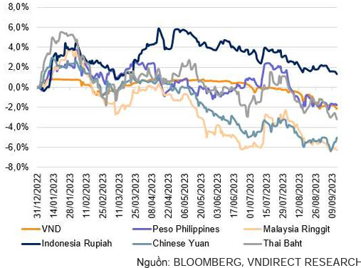 Chỉ số DXY tăng đã gây áp lực lên VND khi tỷ giá USD/VND liên ngân hàng leo lên mức 24.147 vào ngày 13/09/2023 (+1,9% so với cuối tháng 7 và +2,2% so với đầu năm). Áp lực càng gia tăng bởi Trung Quốc nới lỏng tiền tệ gây áp lực lên đồng NDT và chúng tôi nhận thấy rằng trong quá khứ VND có tương quan cao với đồng NDT, áp lực lạm phát trong nước tăng lên trong những tháng cuối năm 2023.