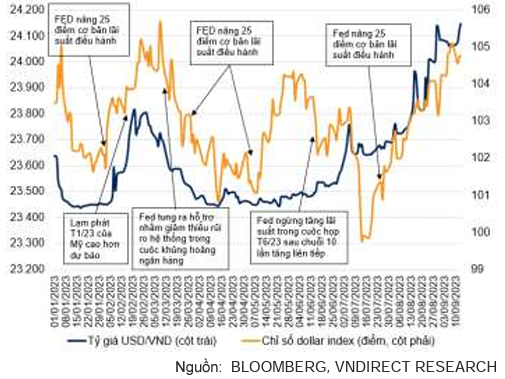 Chỉ số DXY tăng lên 105,58 điểm vào ngày 25/09/2023 (+3,8% so với cuối tháng 7). Sự gia tăng của DXY được thúc đẩy bởi Fed gia tăng khả năng tăng lãi suất điều hành thêm một lần nữa trong năm nay do dữ liệu kinh tế khả quan và lợi suất TPCP Mỹ tăng cao do chính phủ Mỹ tăng cường phát hành TPCP để bù đắp thâm hụt ngân sách.