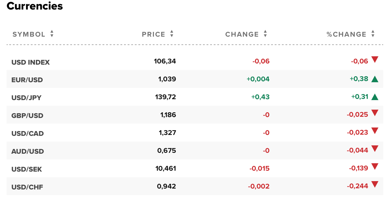 Hiện 1 euro đổi 1,039 USD. 1 bảng Anh đổi 1,186 USD. 1 USD đổi 139,72 yên. 1 USD đổi 1,327 đô la Canada. 1 đô la Úc đổi 0,675 USD, 1 USD đổi 0,942 France Thụy Sĩ.