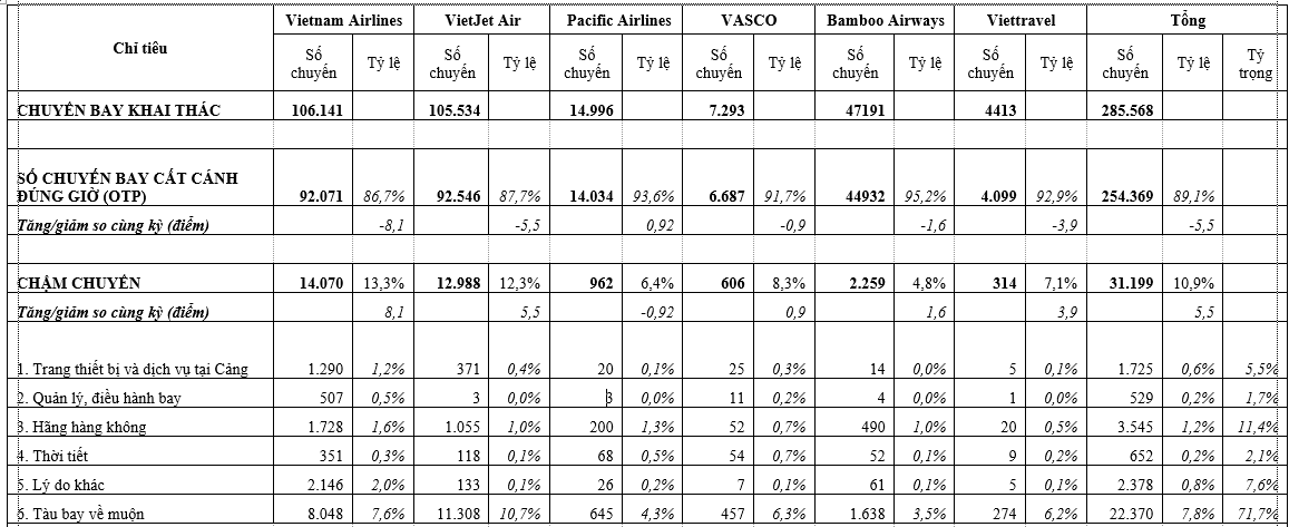 Bên cạnh đó, có 31.199 chuyến bay bị chậm, tăng 5,5% so với cùng kỳ năm 2021. Nguyên nhân chính dẫn đến tình trạng chậm chuyến của các hãng bao gồm: Trang thiết bị và dịch vụ tại Cảng; quản lý và điều hành bay; hãng hàng không; thời tiết; máy bay về muộn và các lý do khác. Trong đó, máy bay về muộn là nguyên chính dẫn đến tình trạng chuyến bay cất cánh trễ giờ trong giai đoạn này, với tỷ trọng 71,7%.