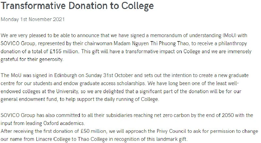 Linacre College – một đại học thuộc đại học Oxford cho biết đã ký một biên bản ghi nhớ (MoU) với Sovico Group của tỷ phú Nguyễn Thị Phương Thảo để nhận một khoản tài trợ trị giá 155 triệu bảng Anh.