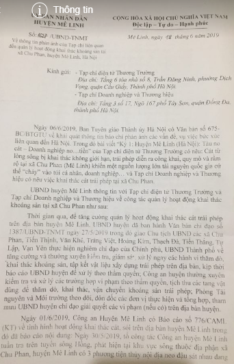 Đến ngày 18/06/2019, Tạp chí Thương Trường nhận được công văn số: 1627/UBND-TNMT do Phó Chủ tịch UBND huyện Mê Linh Trần Thanh Hoài ký về thông tin phản ánh của Tạp chí liên quan đến quản lý hoạt động khai thác khoáng sản tại xã Chu Phan (Mê Linh, TP Hà Nội).