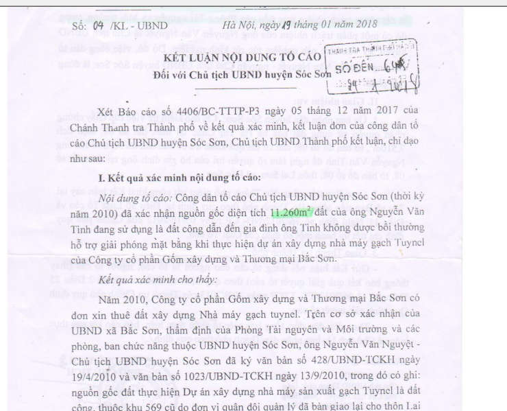 Cụ thể ông Nguyễn Văn Tình tố cáo Chủ tịch UBND huyện Sóc Sơn thời kỳ 2010 - Nguyễn Văn Nguyệt ký xác nhận nguồn gốc phần đất diện tích 11.260m của ông Tình là đất công và giao cho Công ty CP gốm xây dựng và thương mại Bắc Sơn (gọi tắt là Công ty Bắc Sơn) thực hiện dự án xây dựng nhà máy gạch Tuynel dẫn đến việc gia đình ông Tình không được bồi thường hỗ trợ giải phóng mặt.