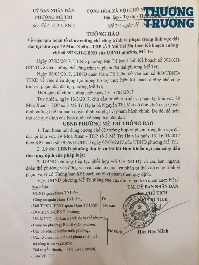 Nghiêm trọng hơn, Quyết định cưỡng chế được ban hành ngày 16/1/2017, thế nhưng không hiểu vì lý do gì mà đến ngày 17/3/2017, UBND phường Mễ Trì lại ra Thông báo về việc hoãn tổ chức cưỡng chế công trình vi phạm trong lĩnh vực đất đai khu vực 79 Mùa Xuân, Tổ dân phố số 3 Mễ Trì Hạ. Lý do UBND phường đưa ra là: “Bà Mai có đơn khiếu nại quyết định cưỡng chế thi hành quyết định xử phạt hành chính. Do đó, UBND phường tạm hoãn việc cưỡng chế để thụ lý và trả lời đơn khiếu nại của công dân theo quy định của pháp luật”.