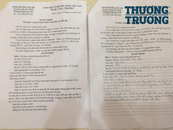 Ngay sau đó, ngày 5/12/2016, UBND phường Mễ Trì cũng đã có Quyết định xử phạt vi phạm hành chính trong lĩnh vực đất đai đối với hộ gia đình bà Mai. Theo quyết định, mức phạt tiền đối với hành vi sai phạm này là 3,5 triệu đồng, đồng thời buộc khôi phục lại tình trạng ban đầu của khu đất như trước khi vi phạm.