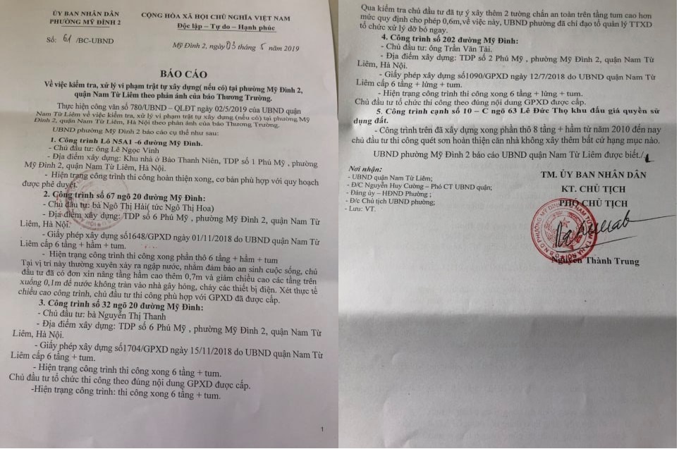 Đồng thời, UBND Phường Mỹ Đình 2 đã có Báo cáo Số 61/BC-UBND về việc kiểm tra, xử lý vi phạm trật tự xây dựng (nếu có) tại Phường Mỹ đình 2, quận Nam Từ Liêm theo phản ánh của Tạp chí Thương Trường.