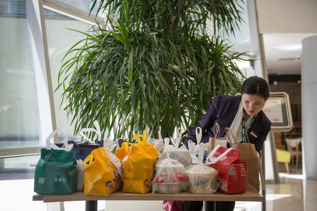 Vào giờ cao điểm, nhân viên giao hàng để đồ ăn dưới sảnh văn phòng để tiết kiệm thời gian. Ảnh: New York Times.