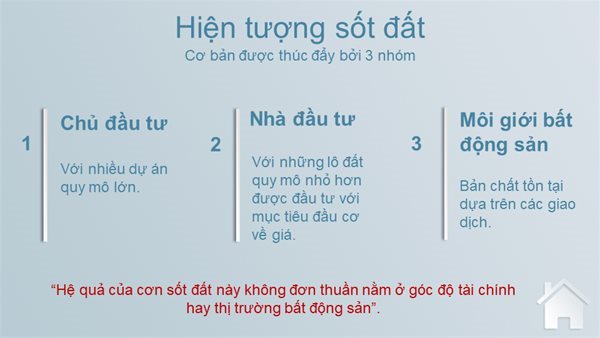 Thực tế cho thấy hiện tượng sốt đất gần đây đa phần được thúc đẩy bởi ba nhóm: chủ đầu tư (với các dự án quy mô lớn), nhà đầu tư (với những lô đất quy mô nhỏ hơn được đầu tư với mục tiêu đầu cơ về giá) và môi giới bất động sản (với bản chất tồn tại dựa trên các giao dịch), trong khi đó, trong rất nhiều trường hợp, những người có nhu cầu sử dụng đất thật sự lại không đủ khả năng tiếp cận đến quỹ đất phù hợp.