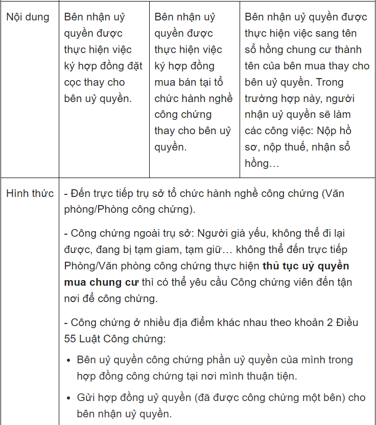 Theo phân tích ở trên, thường có 03 giai đoạn khi thực hiện mua bán chung cư có thể uỷ quyền. Về thủ tục uỷ quyền mua chung cư, cả 03 giai đoạn đều phải đáp ứng theo trình tự quy định của Bộ luật Dân sự, Luật Công chứng, Luật Nhà ở như sau: