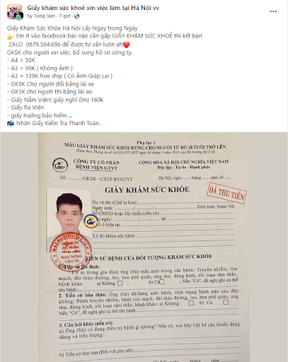 Trong thời đại công nghệ số bùng nổ, việc mua bán các sản phẩm, dịch vụ trên mạng xã hội trở nên phổ biến và tiện lợi hơn bao giờ hết. Không chỉ những hàng hóa thông thường, mà cả những loại giấy tờ như “giấy khám sức khỏe” cũng có thể dễ dàng mua được chỉ với vài thao tác tìm kiếm vô cùng đơn giản và nhanh gọn.