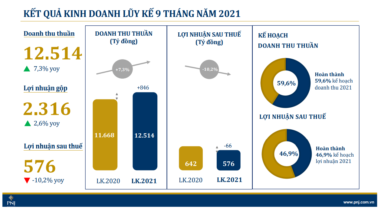 Lũy kế 9 tháng đầu năm, PNJ ghi nhận doanh thu thuần đạt 12.514 tỷ đồng (tăng 7,3%) hoàn thành 59,6% kế hoạch năm 2021 và LNST đạt 576 tỷ đồng (giảm 10,2%), hoàn thành 46,9% kế hoạch năm 2021. Tỷ lệ LNG/DTT đạt 18% so với mức 18,8% cùng kỳ 2020.