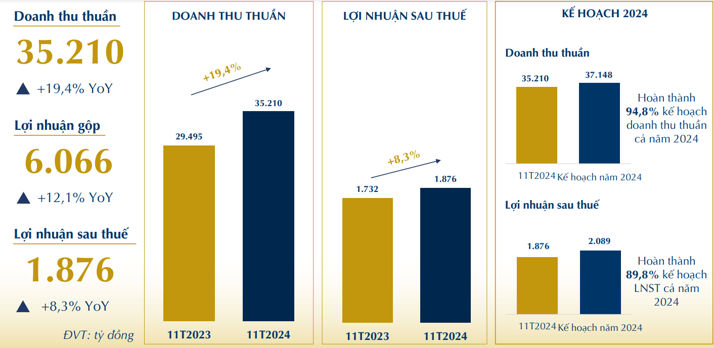 Lũy kế 11 tháng năm 2024 công ty đạt doanh thu thuần đạt 35.210 tỷ đồng, tăng 19,4% so với cùng kỳ năm ngoái.