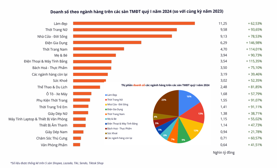 Trong bức tranh chung kinh doanh trên sàn thương mại điện tử quý 1-2023, với việc mang lại tổng cộng 11,25 nghìn tỷ đồng cho cả 5 sàn thương mại điện tử trong 3 tháng đầu năm, ngành hàng làm đẹp tiếp tục duy trì vị trí quán quân trong bảng xếp hạng những ngành hàng có doanh số cao nhất, tăng trưởng đến gần 150%.