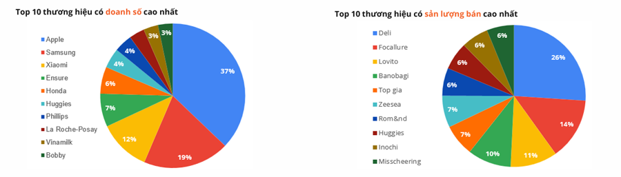 Theo thống kê về mặt thương hiệu, điện thoại, mô tô xe máy, nhà cửa- đời sống, điện gia dụng, thực phẩm & đồ uống, mẹ & bé và làm đẹp là những ngành hàng sở hữu các thương hiệu có doanh thu và sản lượng cao nhất trên các sàn thương mại điện tử.
