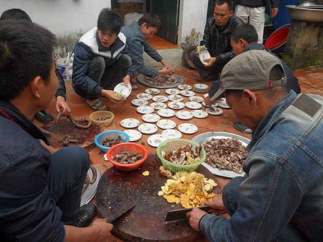 Cứ mùng 4 Tết Nguyên đán, tại Thôn Yên Trường (xã Trường Yên, Chương Mỹ, Hà Nội) lại nhộn nhịp cùng nhau mở tiệc ăn thịt chó "đổi món" đầu xuân lấy may mà không cần kiêng kỵ gì.