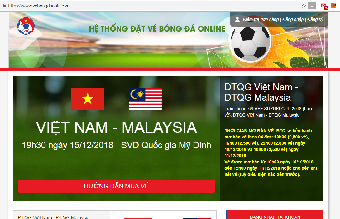 Người hâm mộ cũng cần lưu ý thêm, gần thời điểm mở bán vé trận chung kết lượt về AFF Cup 2018 một số website giả mạo với giao diện giống hệt website hệ thống phân phối vé của VFF đã bất ngờ xuất hiện.