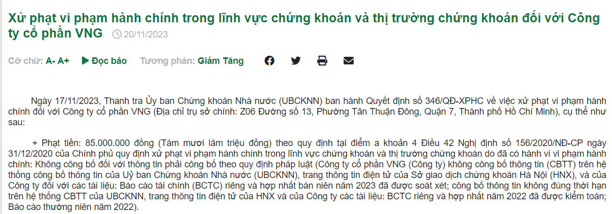 Thanh tra Ủy ban Chứng khoán Nhà nước (UBCKNN) phạt vi phạm hành chính đối với Công ty Cổ phần VNG số tiền 85 triệu đồng vì không công bố đối với thông tin phải công bố theo quy định pháp luật.