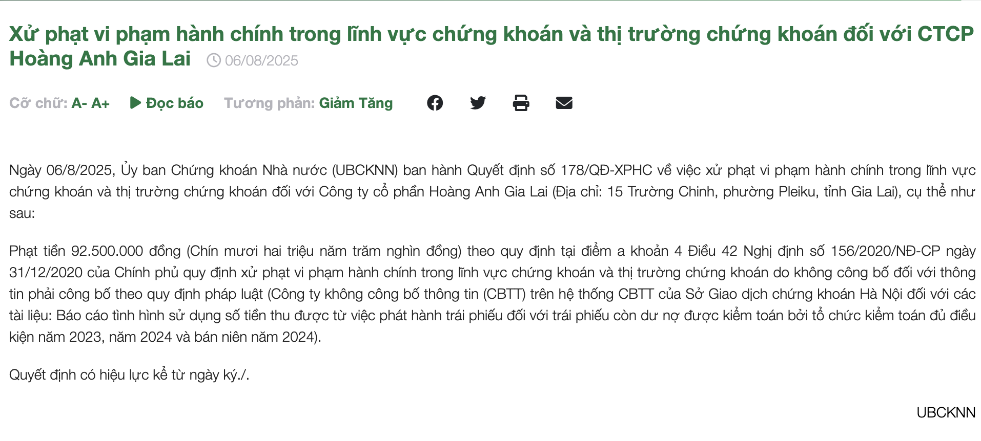 Cụ thể, theo Quyết định số 178/QĐ-XPHC, UBCKNN xác định HAGL đã không công bố các báo cáo về tình hình sử dụng vốn từ phát hành trái phiếu đối với các khoản còn dư nợ, dù đã được kiểm toán bởi đơn vị đủ điều kiện trong các năm 2023, 2024 và bán niên 2024.