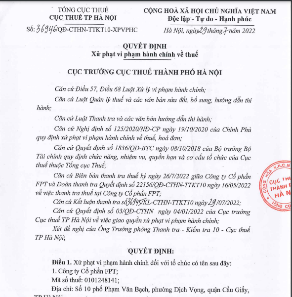 Cục Thuế Hà Nội vừa ban hành quyết định xử phạt hành chính về thuế đối với Công ty Cổ phần FPT ( Số 10 phố Phạm Văn Bạch, Phường Dịch Vọng, Quận Cầu Giấy, Thành phố Hà Nội), mã chứng khoán FPT niêm yết trên Sở Giao dịch Chứng khoán TP. Hồ Chí Minh (HOSE).
