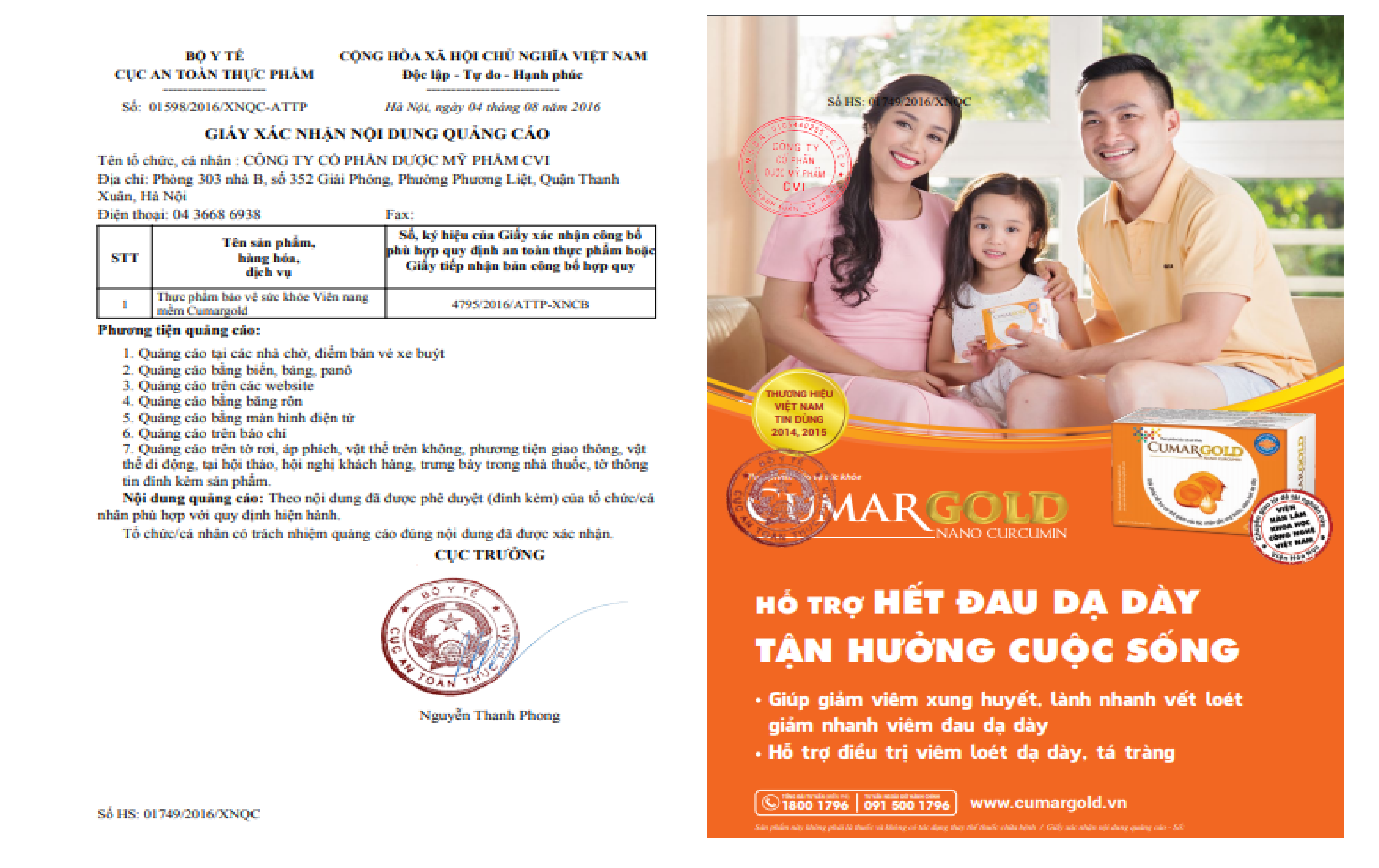 Trong "Giấy xác nhận nội dung quảng cáo" số 01598/2016/XNQC-ATTP, do Cục ATTP cấp ngày 04/08/2016 cho Công ty CVI sản phẩm Cumargold: Là thực phẩm chức năng có tác dụng giúp giảm viêm xung huyết, lành nhanh vết loét giảm nhanh viêm đau dạ dày; Hỗ trợ điều trị viêm loét dạ dày, tá tràng.