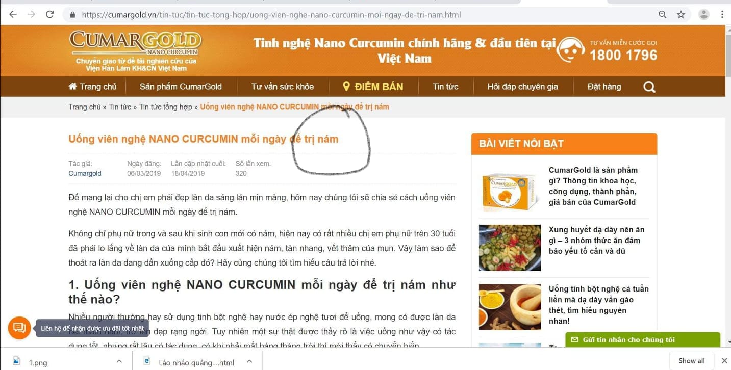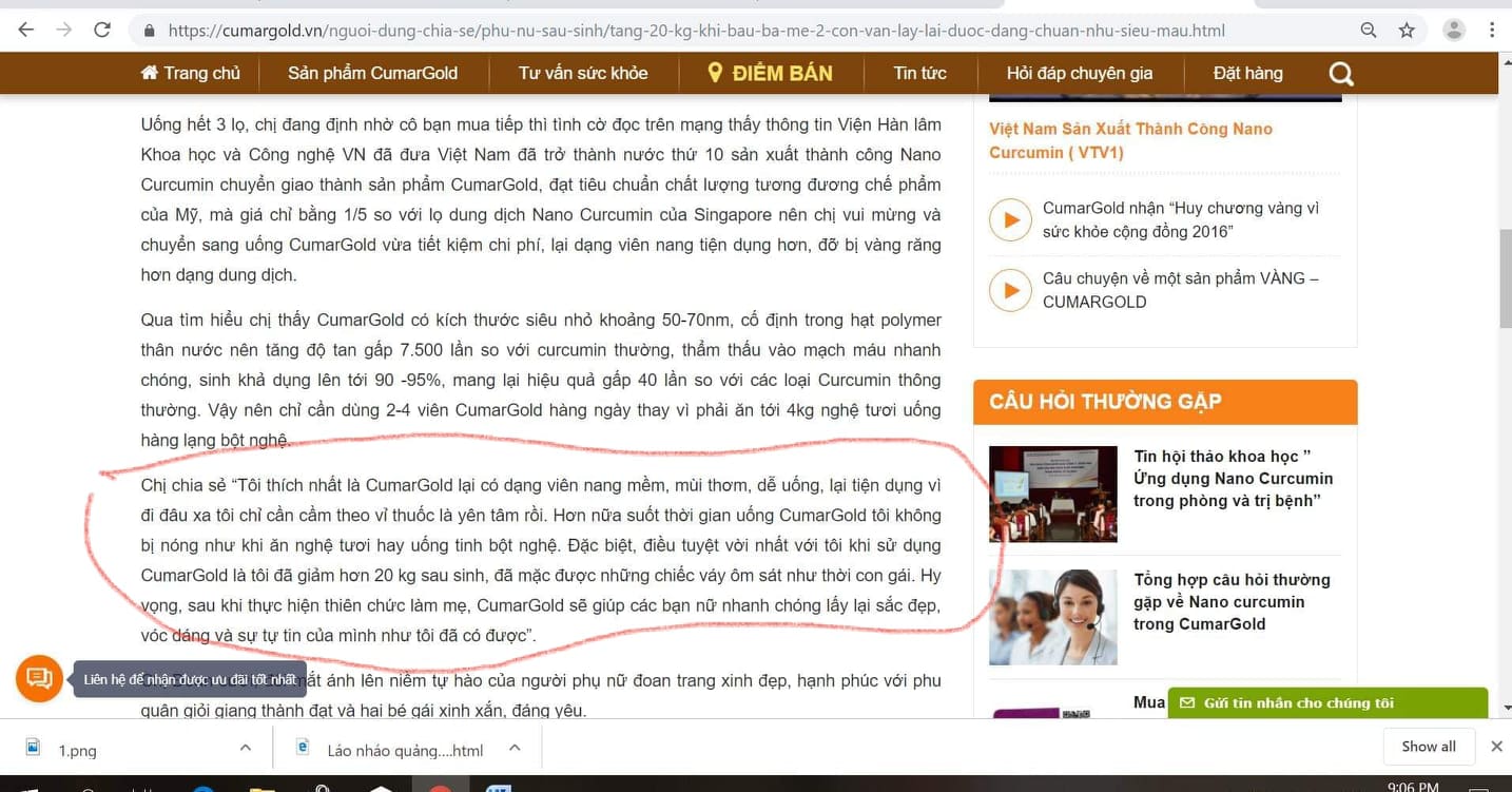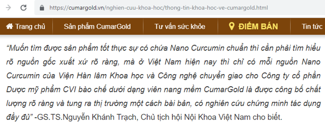 Trên website của công ty CVI khẳng định: “CUMARGOLD – Tinh nghệ Nano Curcumin chính hãng & đầu tiên tại Việt Nam, được hàng triệu người tin tưởng sử dụng” và sử dụng hình ảnh của nhiều chuyên gia, bác sĩ quảng cáo tăng uy tín cho sản phẩm. Điều này có dấu hiệu vi phạm Thông tư 13/BYT về hướng dẫn hoạt động thông tin, quảng cáo thuốc của Bộ Y tế.