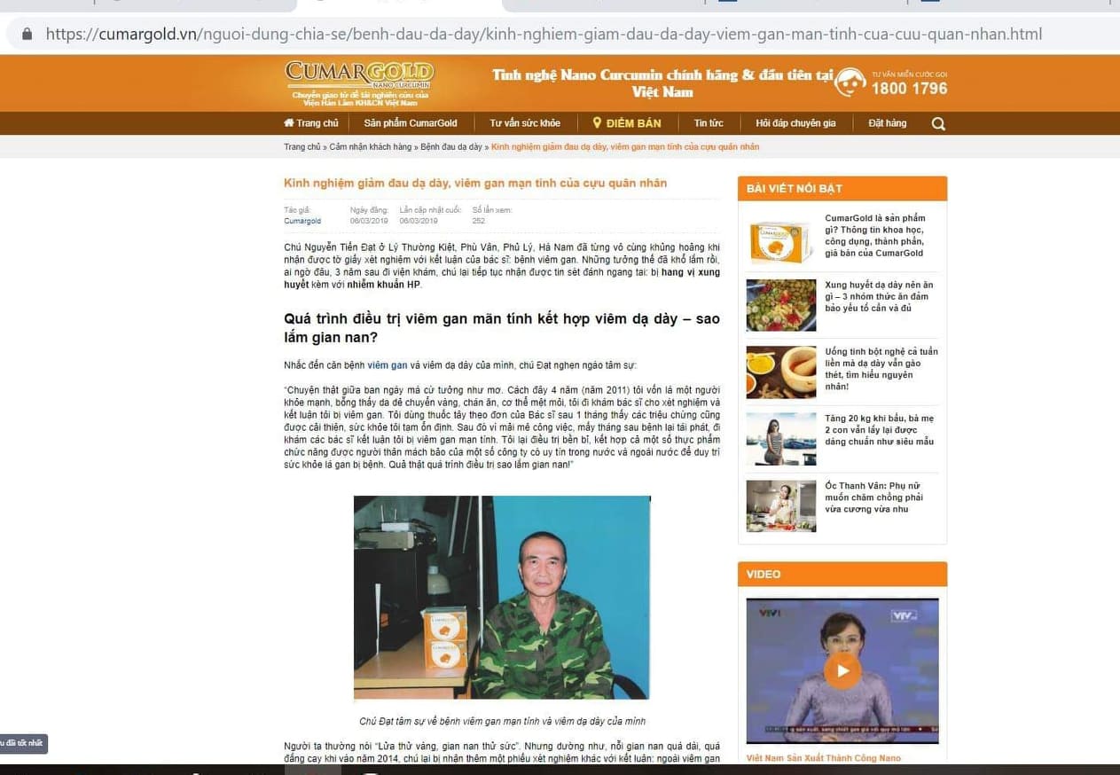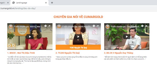 cumargold.vn sản phẩm Cumargold liệt kê một loạt công dụng như: làm nhanh liền sẹo, giảm viêm loét dạ dày, viêm trợt hang vị, xung huyết dạ dày, phòng tái phát và ngăn ngừa các biến chứng loạn sản, chuyển sản ruột, xuất huyết dạ dày, thủng dạ dày, ung thư dạ dày; hỗ trợ cho cơ thể chống lại tác nhân gây ung bướu, giảm độc tính trong hóa trị và xạ trị,... Những nội dung quảng cáo này khiến cho người tiêu dùng nhầm tưởng đây là thuốc chữa bệnh chứ không phải đơn thuần chỉ là thực phẩm chức năng hỗ trợ quá trình điều trị bệnh giúp cải thiện sức khỏe