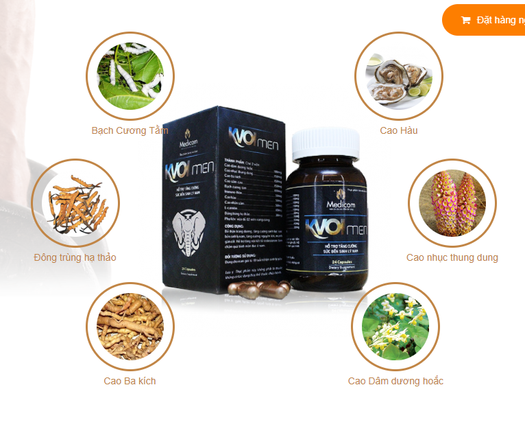 Trên website http://Kvoimen.com quảng cáo với các thành phần như cao ba kích, đông trùng hạ thảo, Cao hàu...như trên thì Kvoi men được quảng cáo có công dụng: Bổ thận tráng dương, tăng cường sinh lực sức bền sinh lý nam, tăng cường nguyên khí, mạnh gân cốt. Hỗ trợ tăng nội tiết tố testosteron làm chậm quá trình mãn dục ở nam (Ảnh màn hình) |