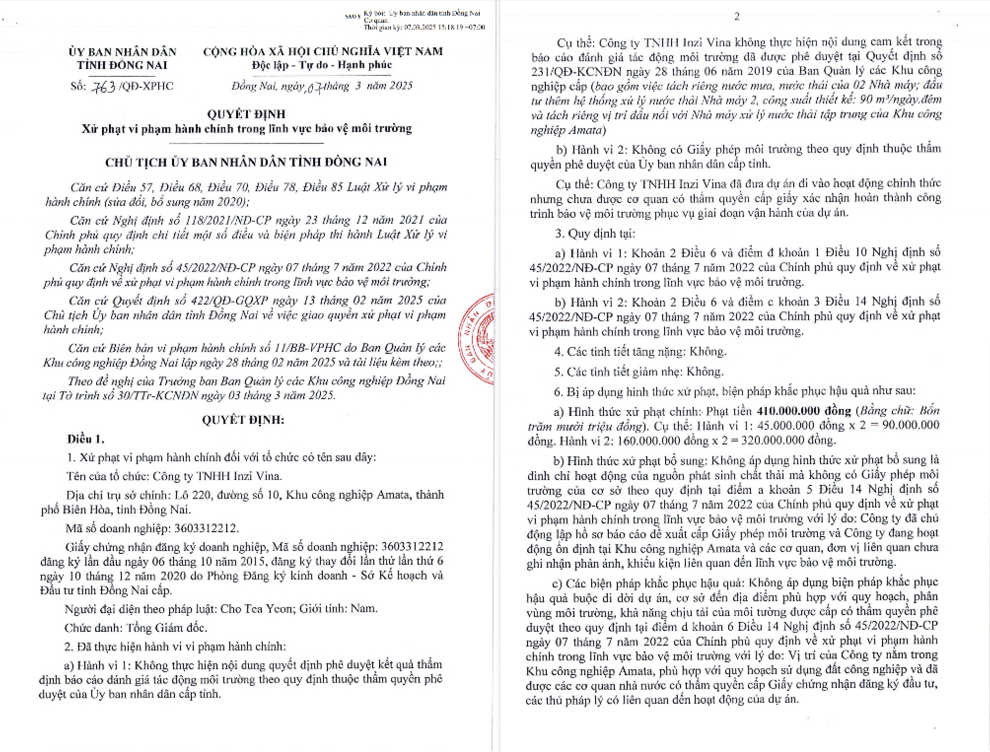 UBND tỉnh Đồng Nai đã ban hành quyết định số 763/QĐ-XPHC về việc xử phạt Công ty TNHH Inzi Vina số tiền 410 triệu đồng do có các hành vi vi phạm hành chính trong lĩnh vực bảo vệ môi trường.