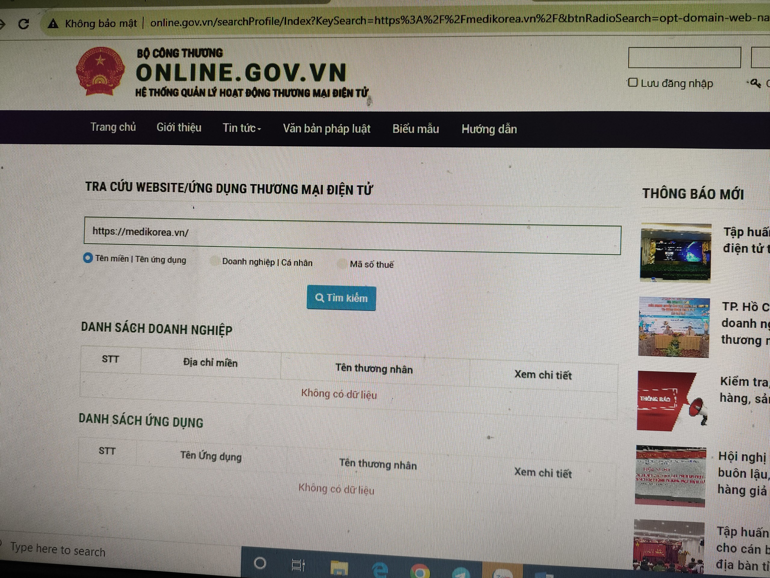 Tên miền https://medikorea.vn không đăng ký trên cổng thông tin Quản lý hoạt động thương mại điện tử www.online.gov.vn của Bộ Công Thương.