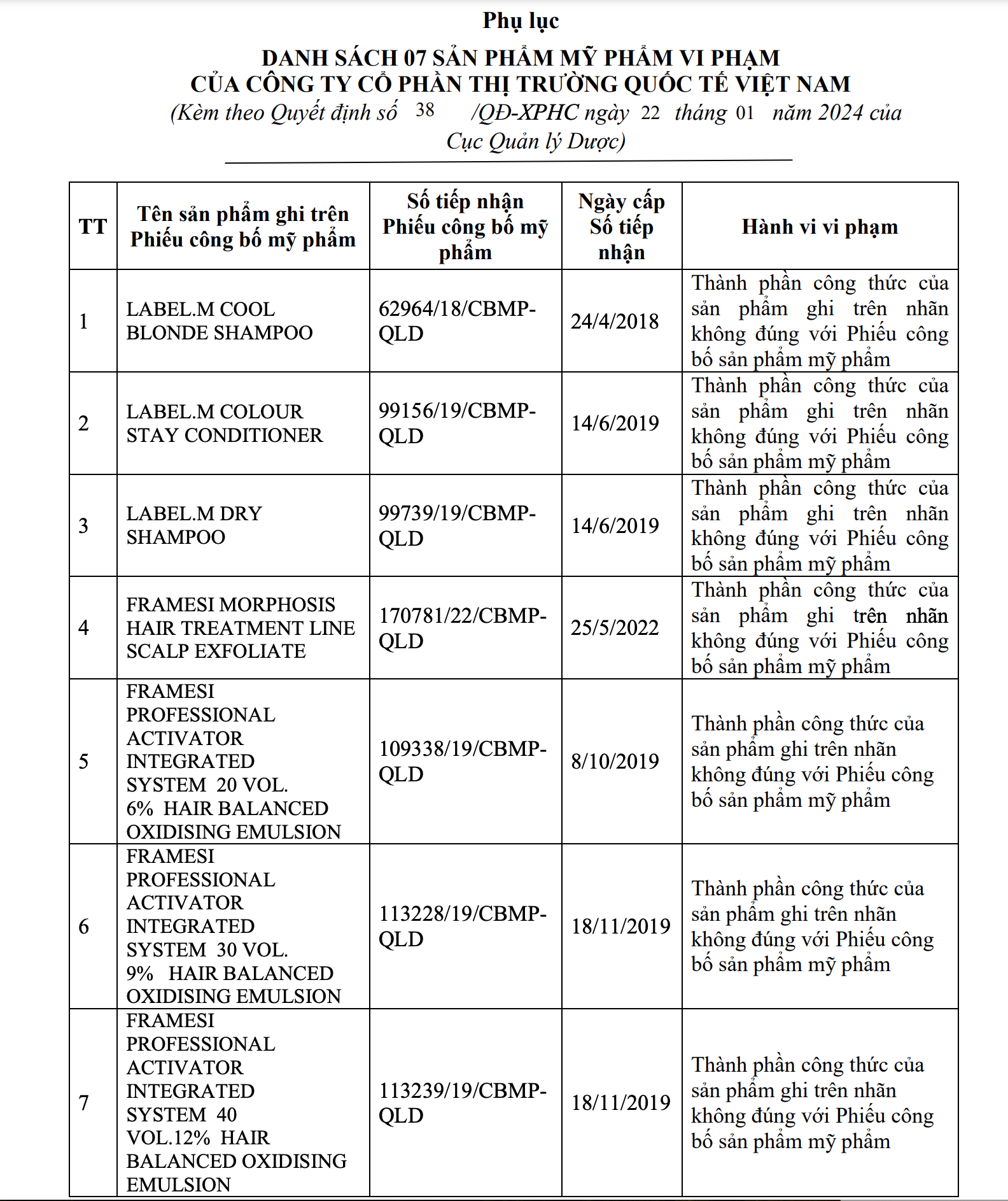 Theo quyết định xử phạt, Công ty CP Thị trường Quốc tế Việt Nam đã thực hiện hành vi vi phạm hành chính khi: kinh doanh mỹ phẩm có thành phần công thức của sản phẩm ghi trên nhãn không đúng với Phiếu công bố sản phẩm mỹ phẩm đối với 7 sản phẩm: