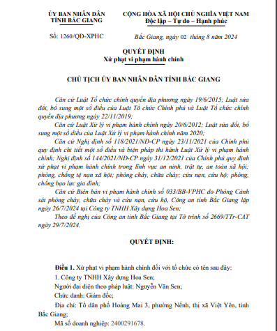 Thông tin từ UBND tỉnh Bắc Giang cho biết, ngày 2/8, UBND tỉnh Bắc Giang đã có Quyết định xử phạt số 1260/QĐ-XPHC xử phạt vi phạm hành chính đối với Công ty TNHH Xây dựng Hoa Sen (địa chỉ tại tổ dân phố Hoàng Mai 3, phường Nếnh, thị xã Việt Yên, tỉnh Bắc Giang) do ông Nguyễn Văn Sen là người đại diện pháp luật.