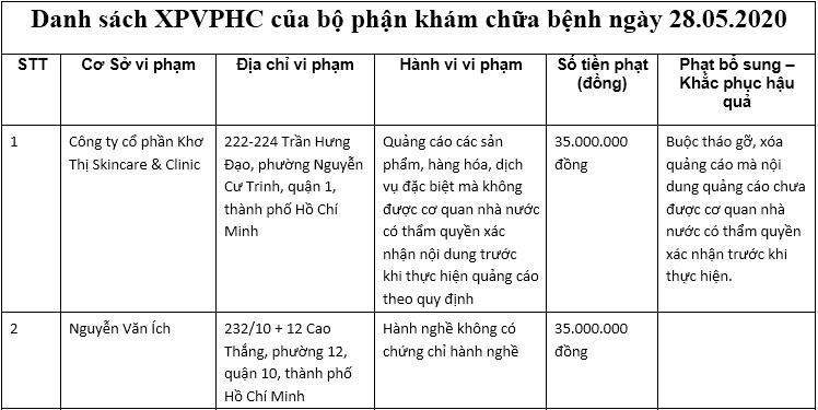 Danh sách XPVPHC của bộ phận khám chữa bệnh ngày 28/5/2020.