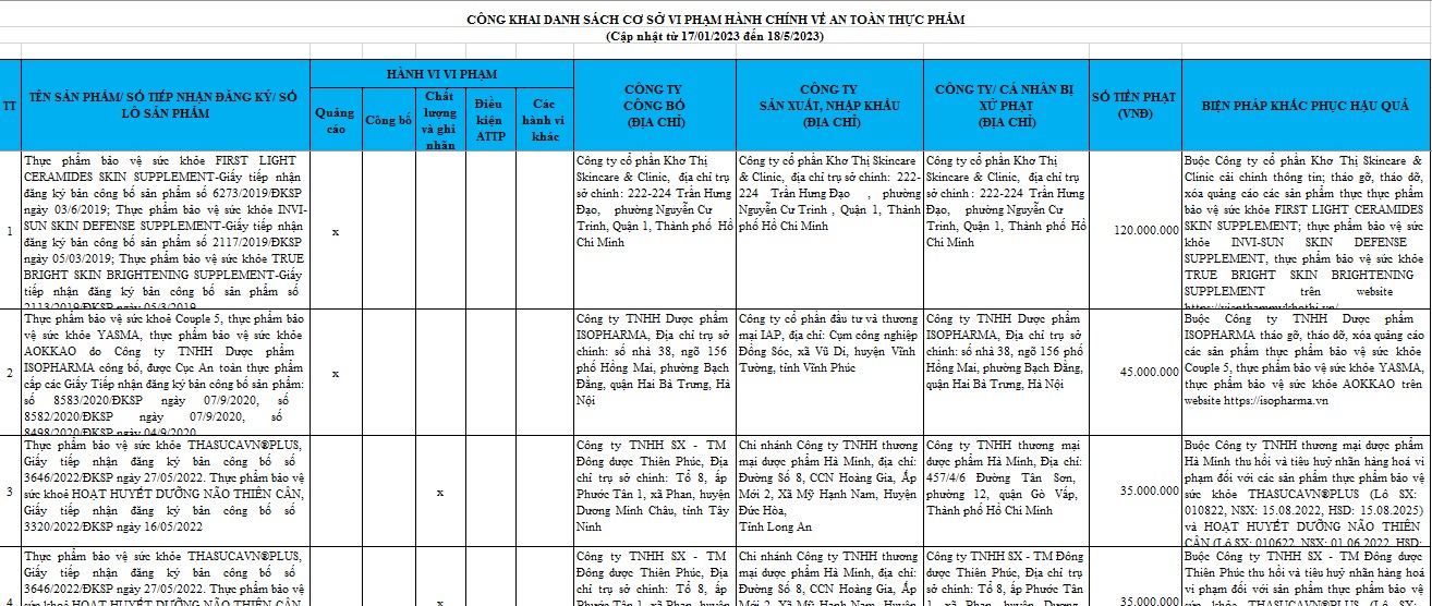 Cục An toàn thực phẩm (Bộ Y tế) vừa Công khai danh sách cơ sở vi phạm hành chính về an toàn thực phẩm (cập nhật từ 17/01 đến 18/5/2023). Trong đó, Công ty CP Khơ Thị Skincare & Clini bị xử phạt 120 triệu đồng do vi phạm quy định của pháp luật về quảng cáo.