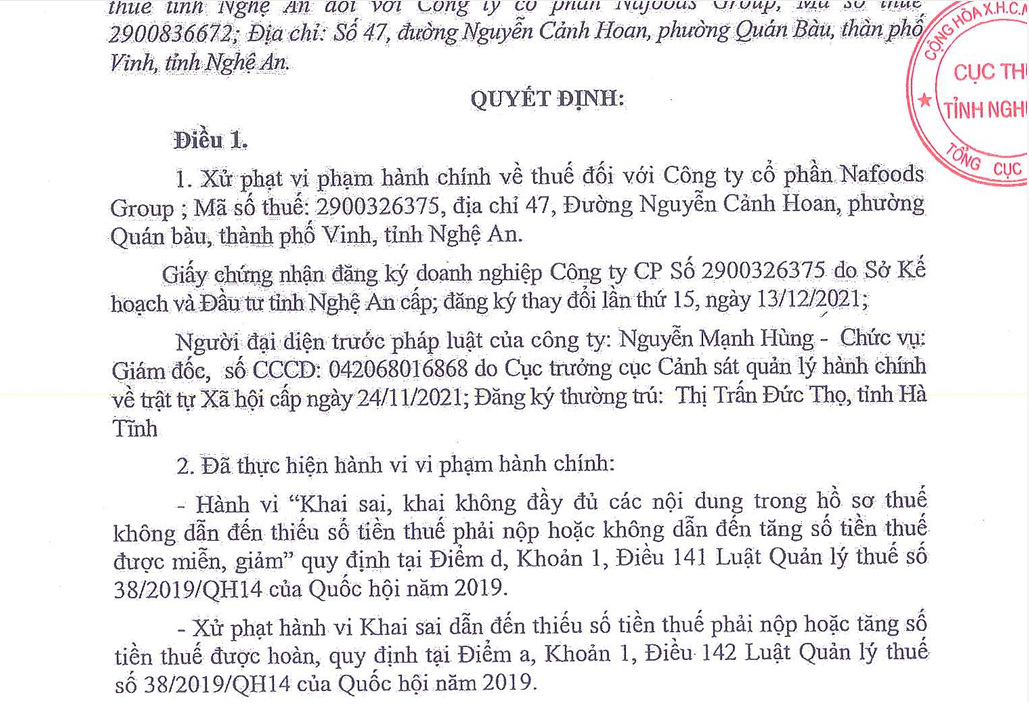 Quyết định xử phạt của Cục thuế Tỉnh Nghệ An nêu rõ, Công ty Cổ phần Nafoods Group (NAF) đã thực hiện hành vi khai sai, khai không đầy đủ các nội dung trong hồ sơ thuế dẫn đến thiếu số tiền thuế phải nộp hoặc tăng số tiền thuế được hoàn.