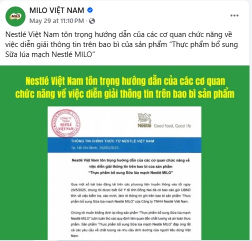 Thông tin chính thức của Công ty TNHH Nestlé Việt Nam kể từ ngày 29/5/2025 "ngay khi" có phản ánh từ báo chí.