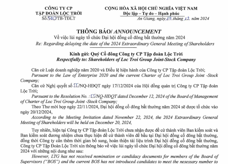 Do đó, HĐQT Lộc Trời quyết định dời lịch tổ chức ĐHĐCĐ bất thường năm 2024 từ ngày 20/12/2024 sang thời điểm khác phù hợp hơn. Thời gian, địa điểm tổ chức, tài liệu và chương trình họp sẽ được công ty thông báo cụ thể trong thư mời họp.