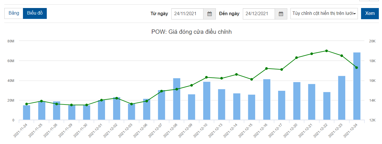Kết thúc phiên ngày 24/12, cổ phiếu POW giảm giá hết biên độ xuống mức 17,250 đồng/cổ phiếu, sau khi vừa lập mức giá đỉnh 19.000 đồng/cp phiên 22/12 vừa qua với thanh khoản "khủng" hơn 68 triệu đơn vị.