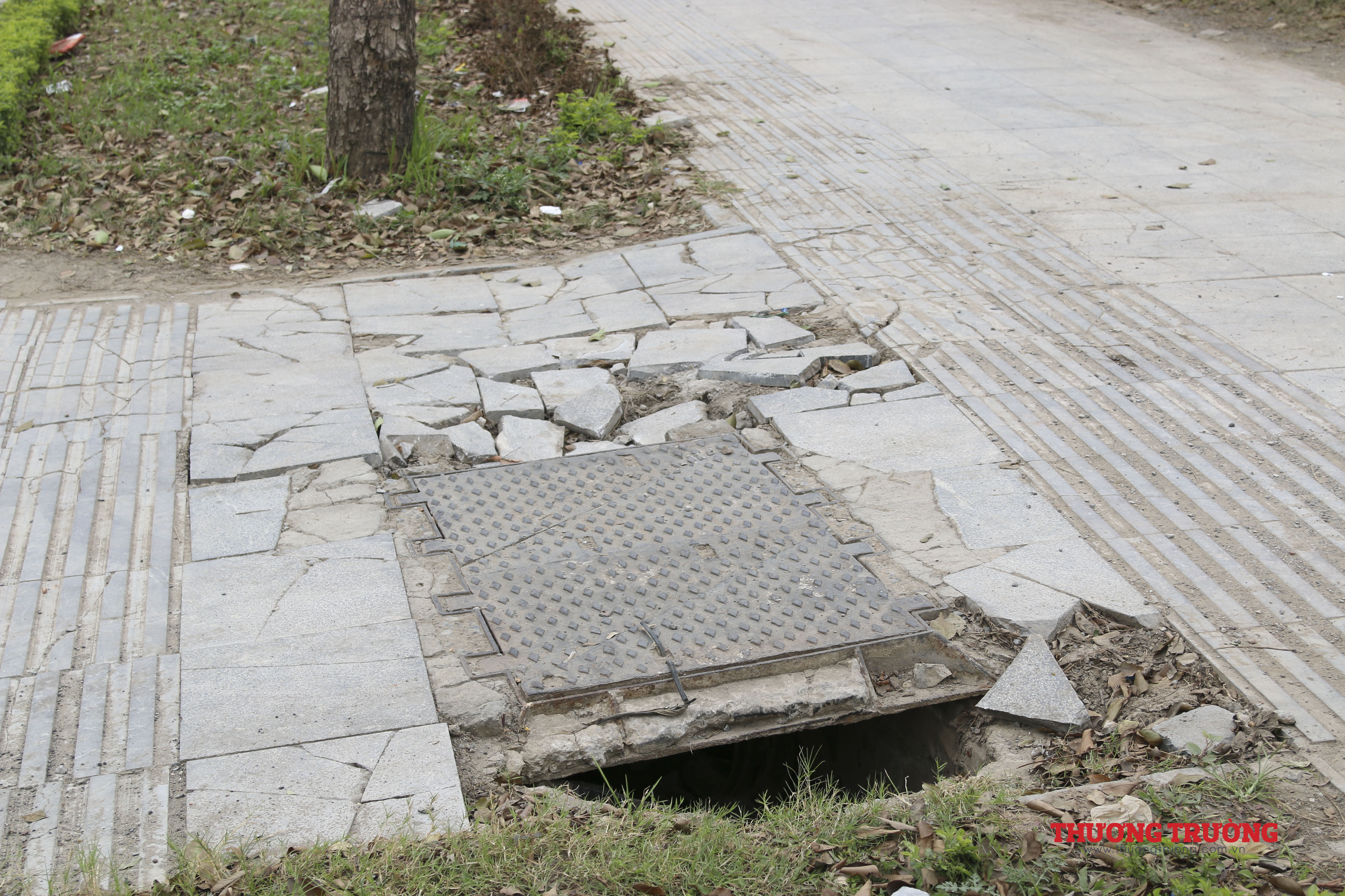 Theo ghi nhận của PV, dọc hai bên vỉa hè, hàng chục vị trí đá tự nhiên trên vỉa hè tuyến đường Trịnh Văn Bô bị vỡ, nát vụn, không còn hình hài, nắp cống hở gây mất an toàn cho người đi bộ.