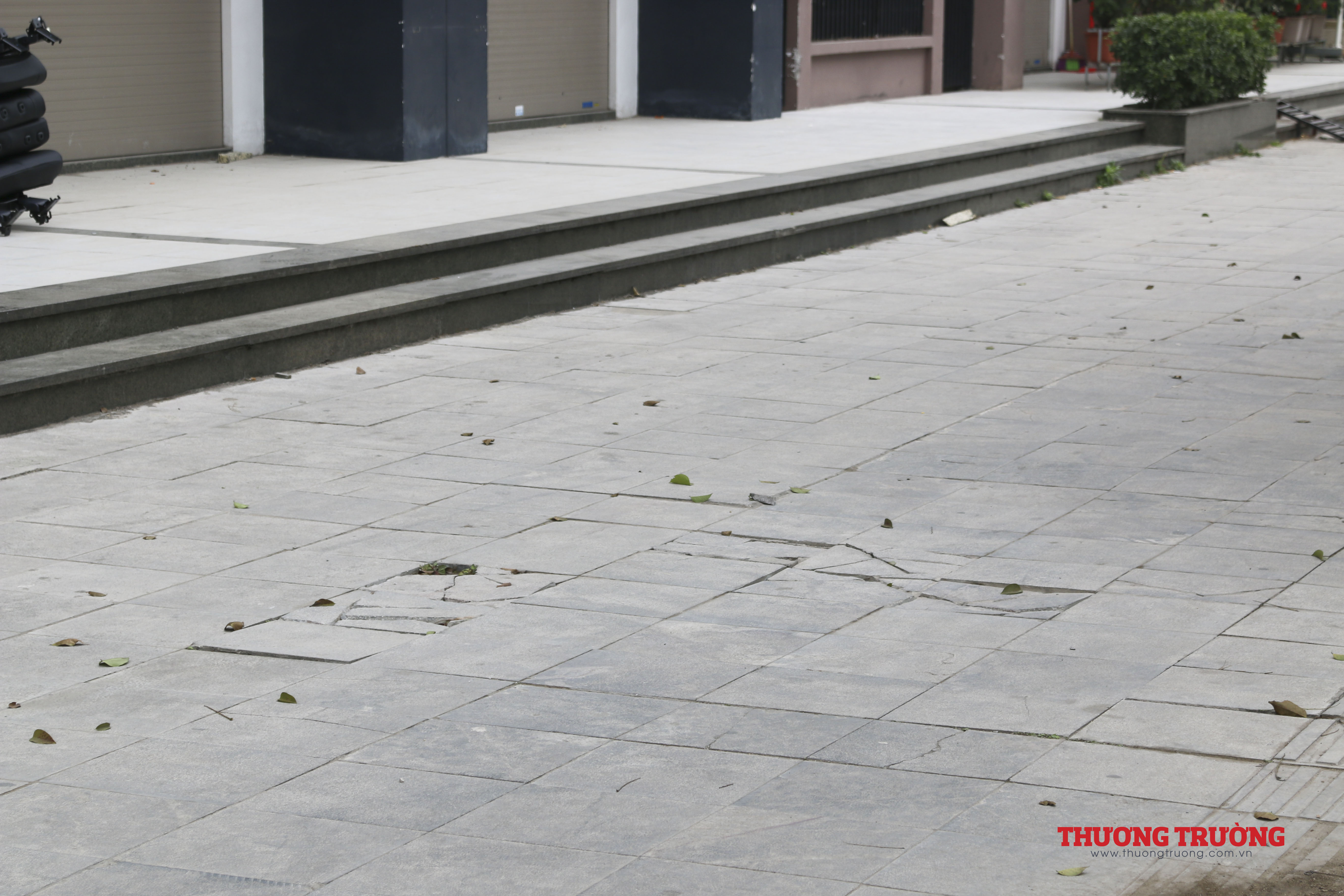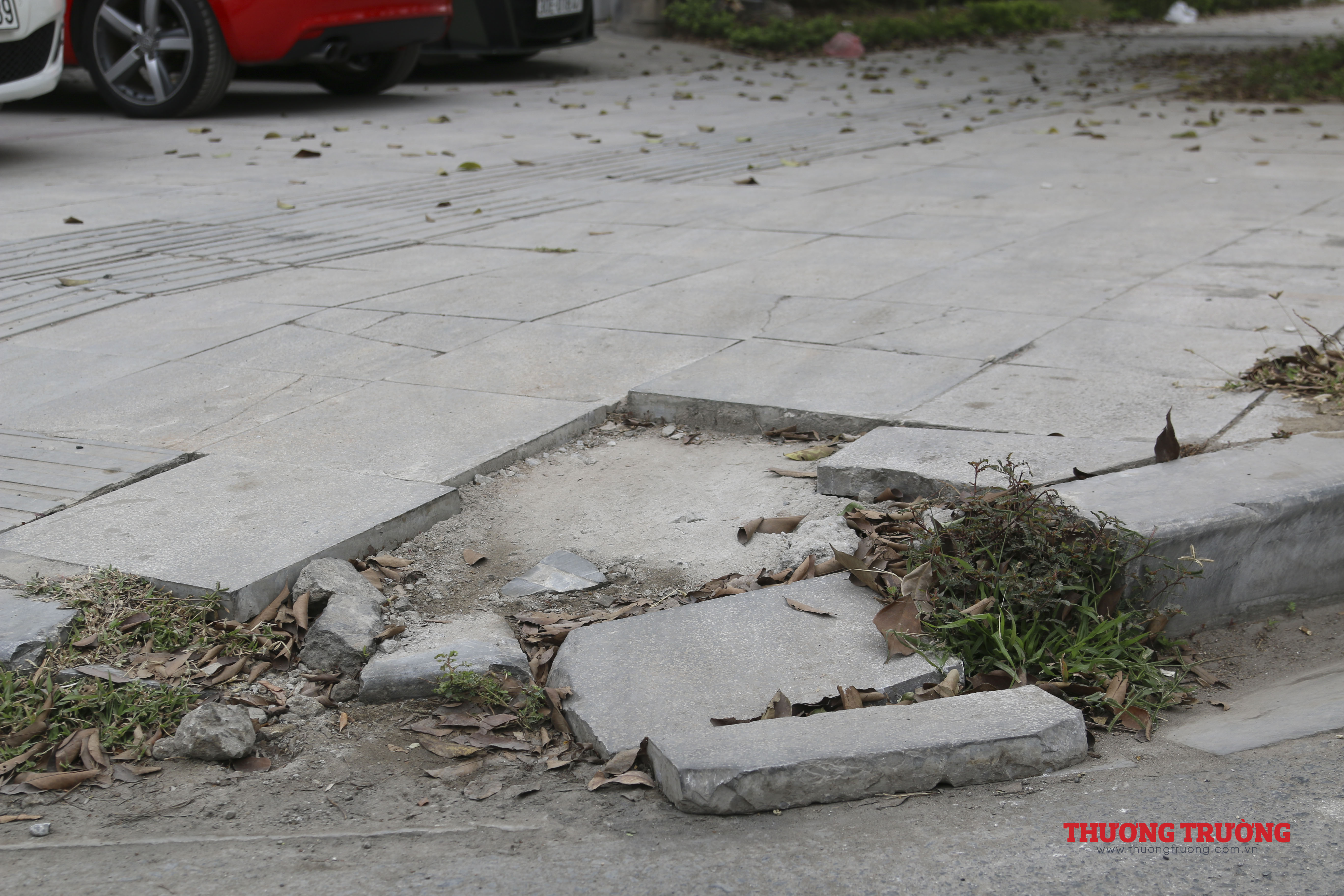 Nhiều khu vực không còn nhận ra vỉa hè được lát bằng đá tự nhiên vì đã vỡ hết, nhiều chỗ ra vào để xe tải chở đổ vật liệu xây dựng.
