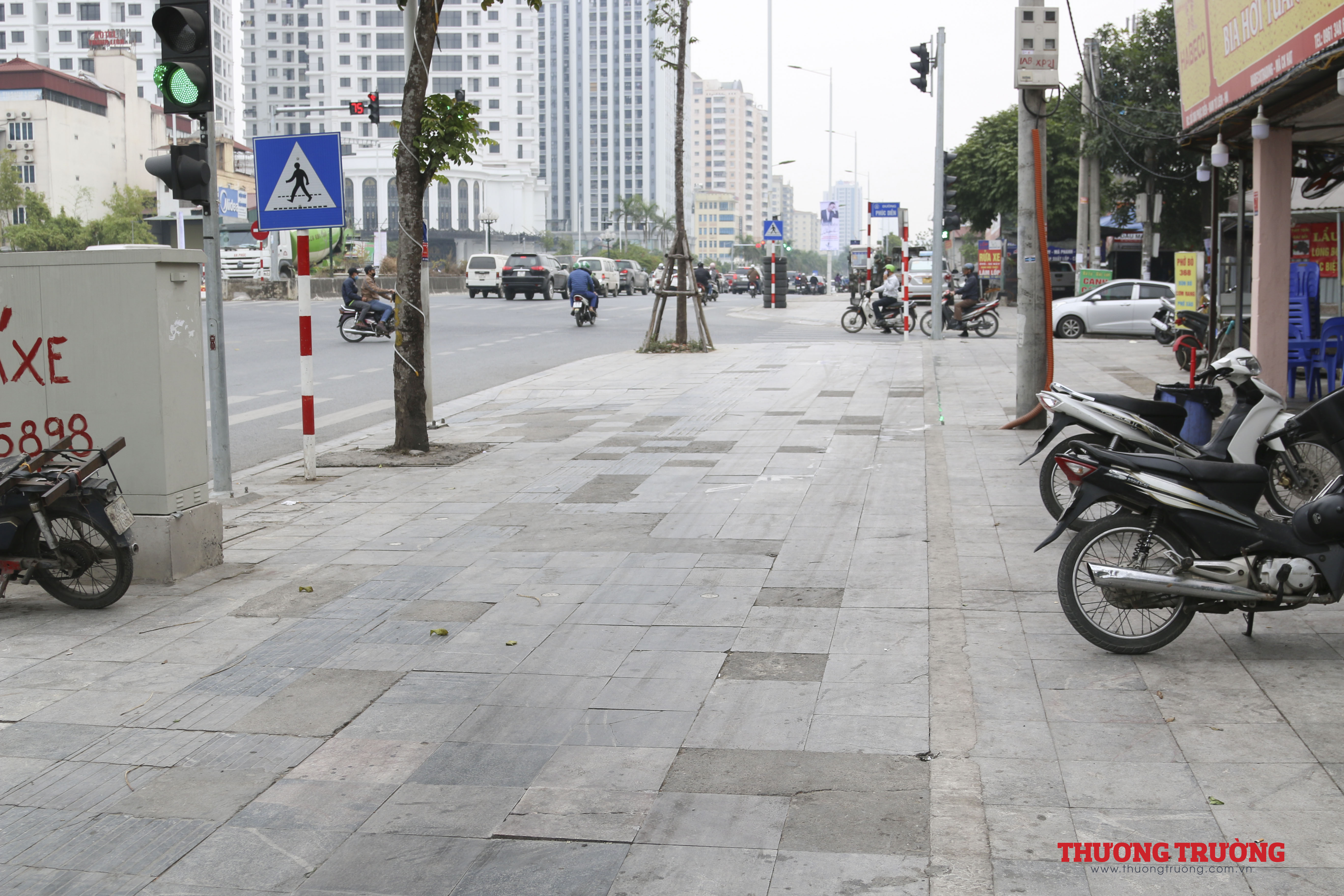 Đáng chú ý khi tại khu vực giao giữa đường Trịnh Văn Bô và đường Phúc Diễn, nhiều vị trí dường như được "vá" bằng bê tông, nên màu sắc lốm đốm khác với đá tự nhiên.