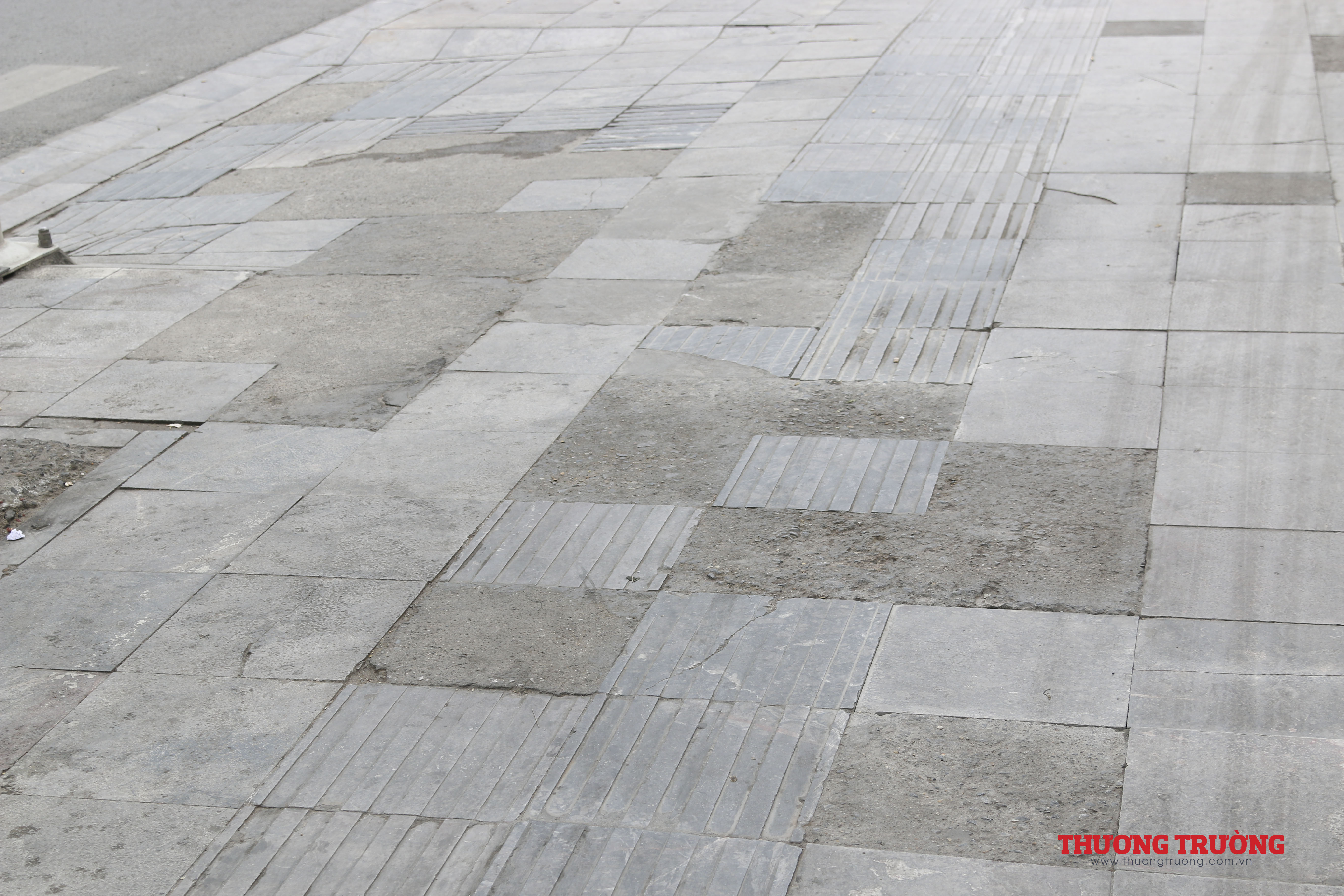 Tuyến đường Trịnh Văn Bô trên địa bàn quận Nam Từ Liêm (Hà Nội) mới được khánh thành khoảng 3 năm nay nhưng hai bên vỉa hè lát bằng đá tự nhiên đã hư hỏng gần như toàn bộ.