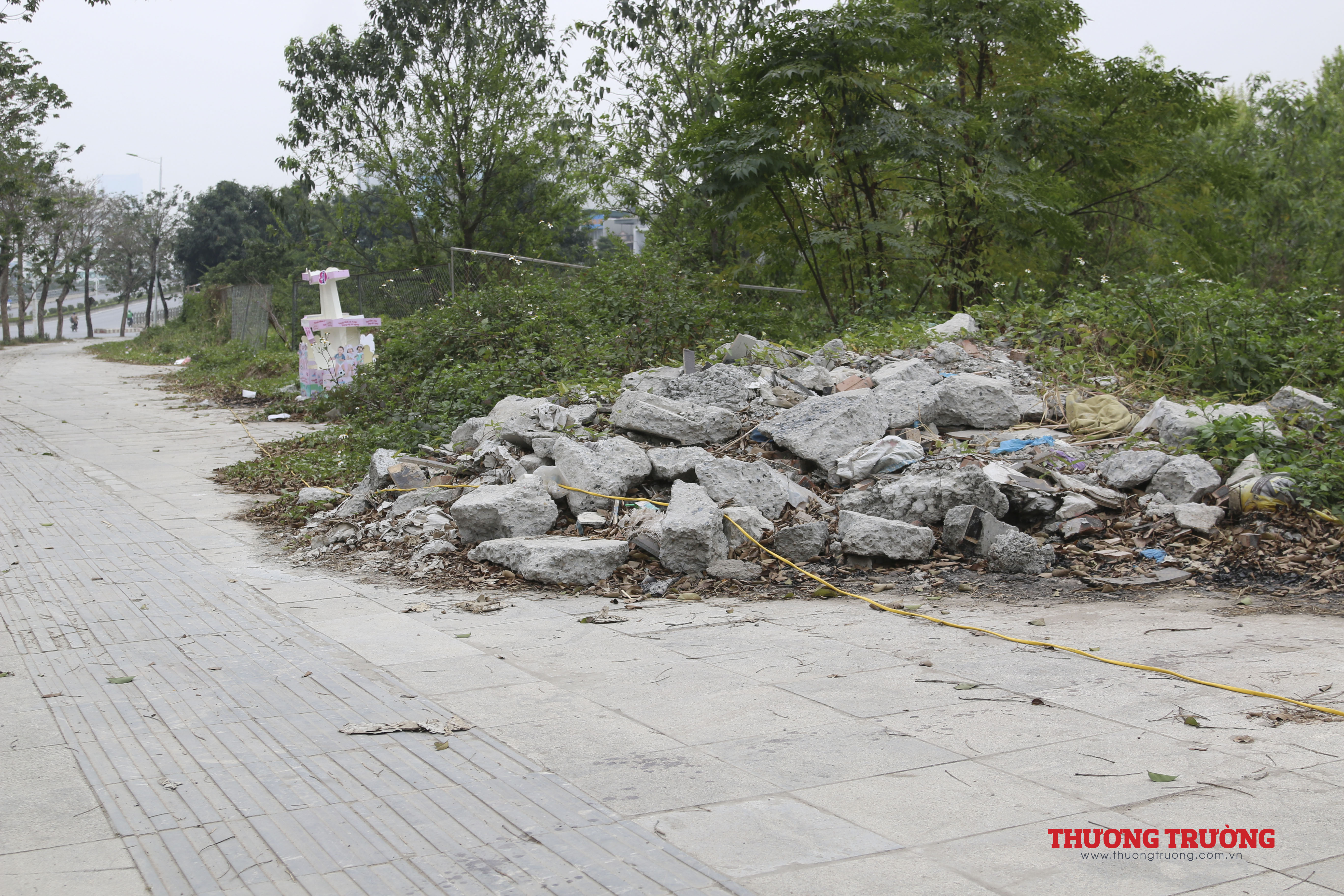 Những đống phế thải xây dựng, bê tông nằm yên trên vỉa hè.