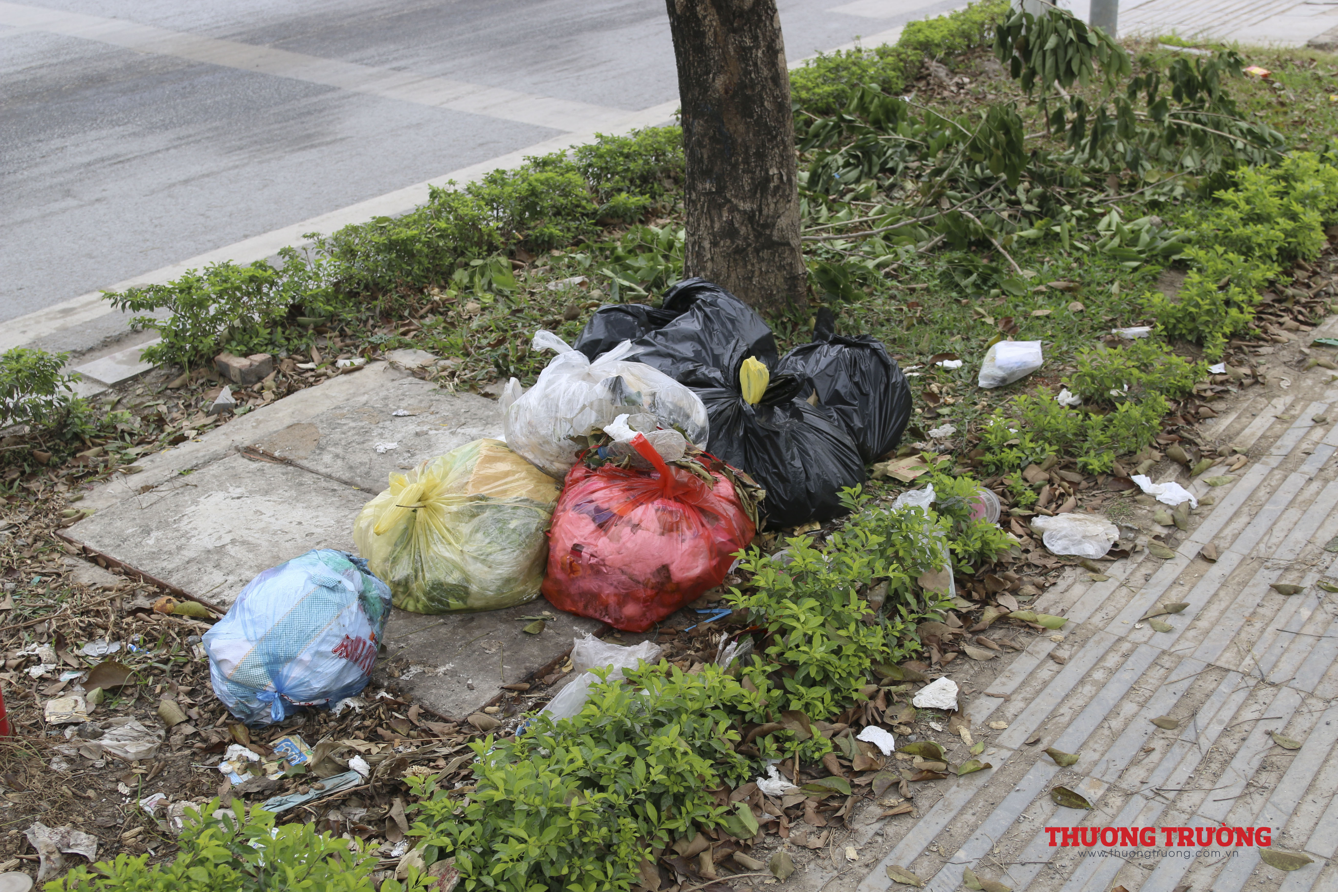 Ven vỉa hè, tiểu cảnh vườn hoa là nơi tập kết những túi nilong rác thải sinh hoạt của các hộ dân.