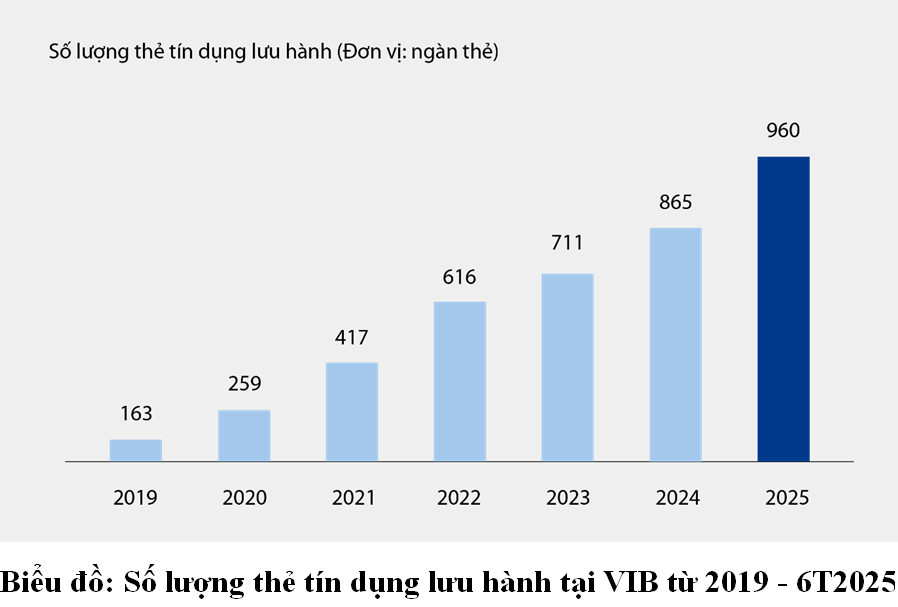 Thu nhập ngoài lãi đóng góp tích cực, chiếm khoảng 21% tổng thu nhập hoạt động, chủ yếu đến từ thu phí và hoạt động dịch vụ. Tính đến 30.06.2025, thẻ tín dụng của VIB đạt gần một triệu thẻ lưu hành, với tổng chi tiêu sau 6 tháng đạt hơn 67.900 tỷ đồng, tăng 15% so với cùng kỳ.