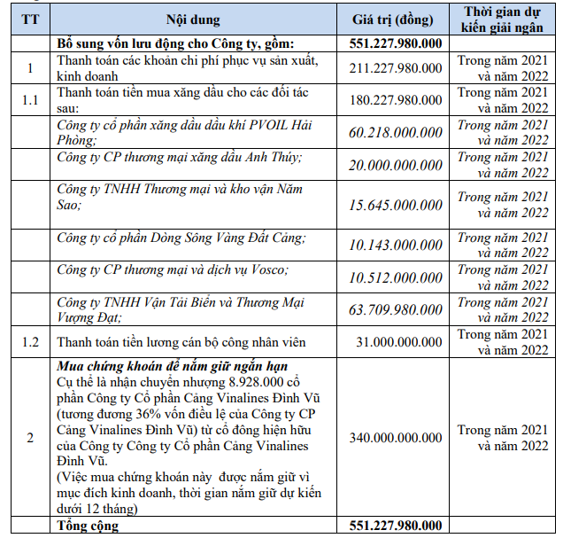 Số tiền thu được từ việc phát hành cổ phiếu dự kiến là 551,2 tỷ đồng sẽ được sử dụng để bổ sung vốn lưu động. Trong đó, Công ty dự kiến sử dụng một phần số tiền thu được là 340.000.000.000 đồng để thanh toán tiền nhận chuyển nhượng 8.928.000 cổ phần Công ty cổ phần Cảng Vinalines - Đình Vũ tương ứng với 36% vốn điều lệ của Công ty cổ phần Cảng Vinalines - Đình Vũ từ cổ đông hiện hữu là Công ty cổ phần Thành Đức Hải Phòng và ông Phạm Văn Đức. Phần còn lại dunfh để thanh toán các chi phí phục vụ sản xuất, kinh doanh cho công ty.