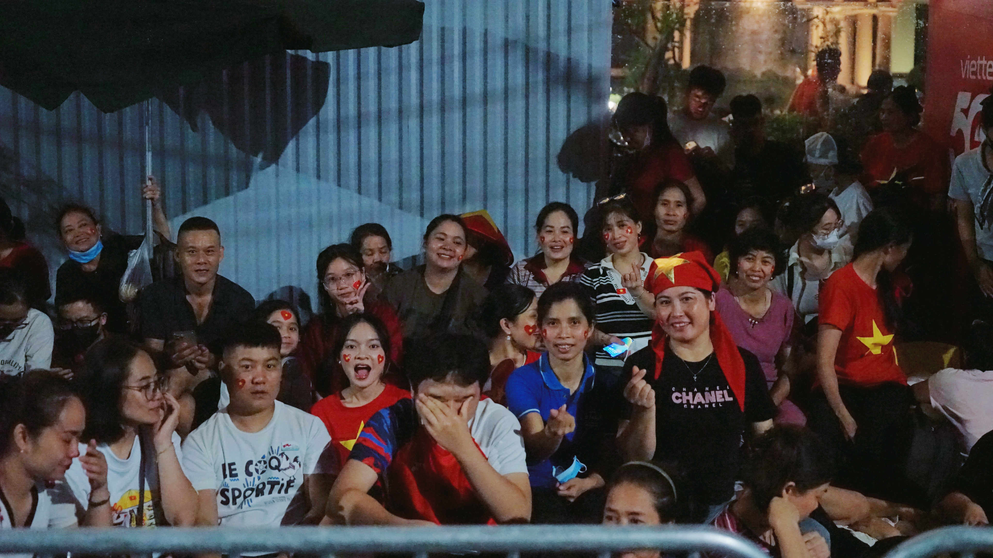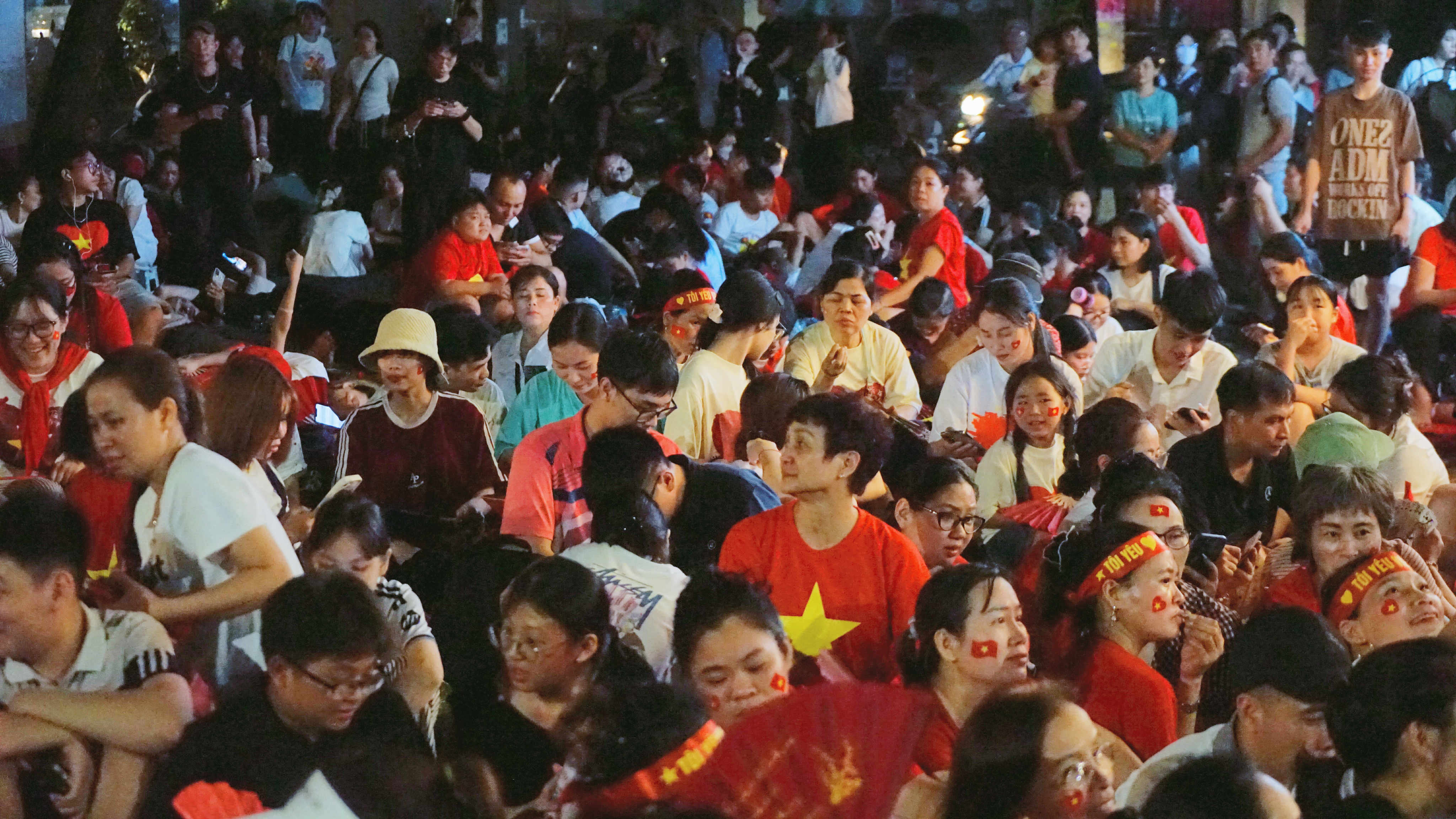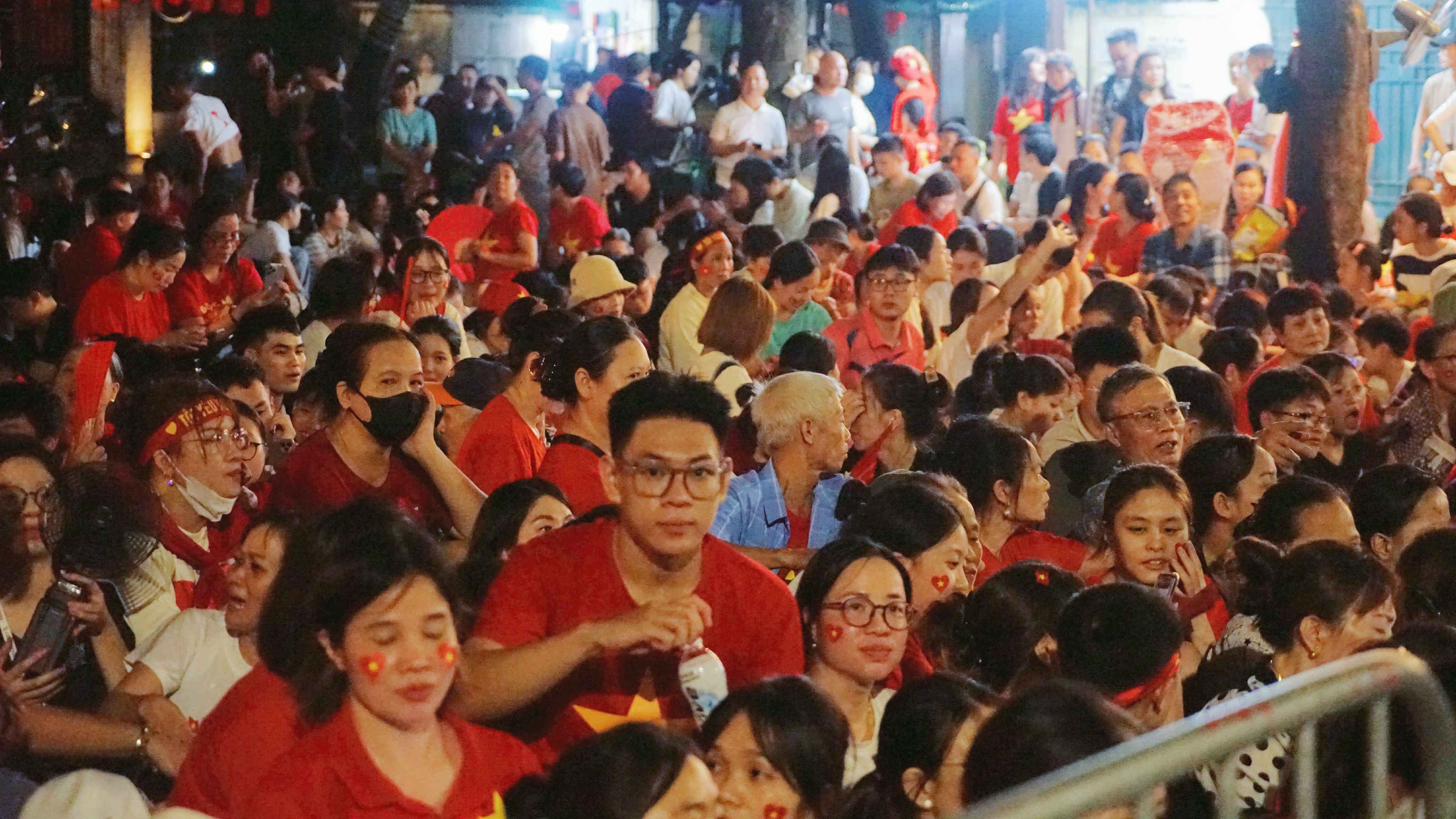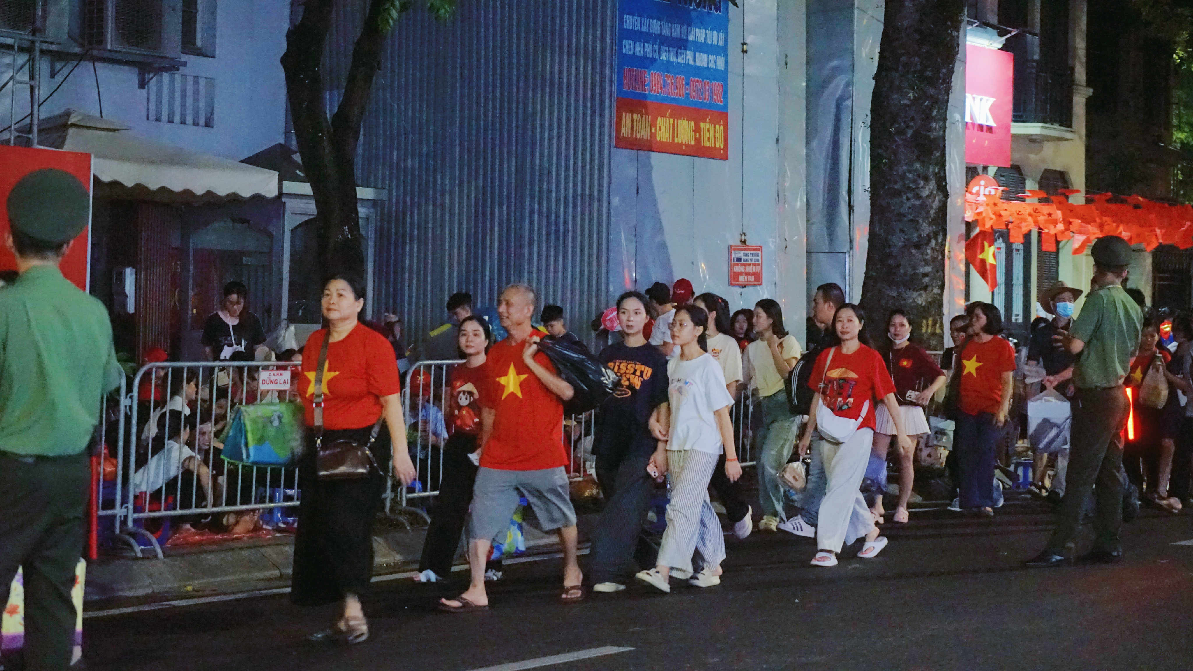 Không quản khuya muộn, hàng nghìn người dân đã ngồi chật kín các tuyến phố. Nhiều gia đình mang theo con nhỏ, nhiều bạn trẻ khoác trên mình màu áo đỏ sao vàng, dán cờ Tổ quốc lên má, tay cầm quốc kỳ phấp phới.