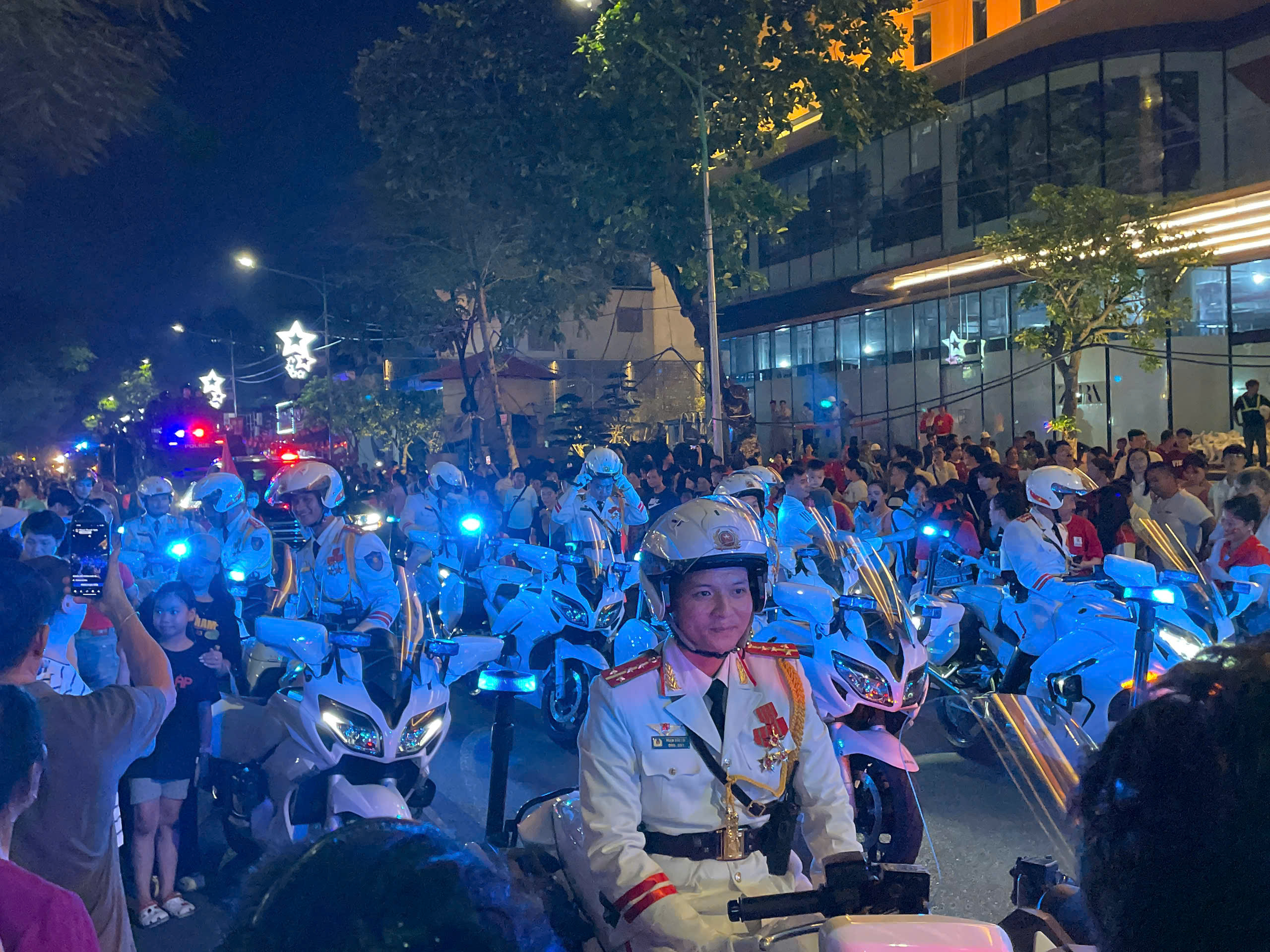 Phía sau, những dãy đèn pha quét sáng cả bầu trời, hắt bóng những người lính thành những đường nét sừng sững, kiêu hãnh. Đó không chỉ là một buổi luyện tập, mà là màn tổng duyệt của ý chí, của sức mạnh, chuẩn bị cho ngày hội lớn của non sông.