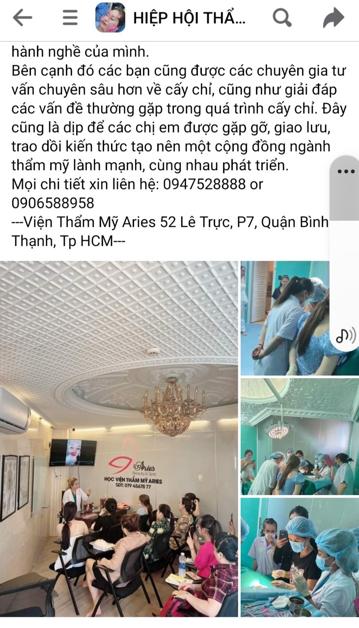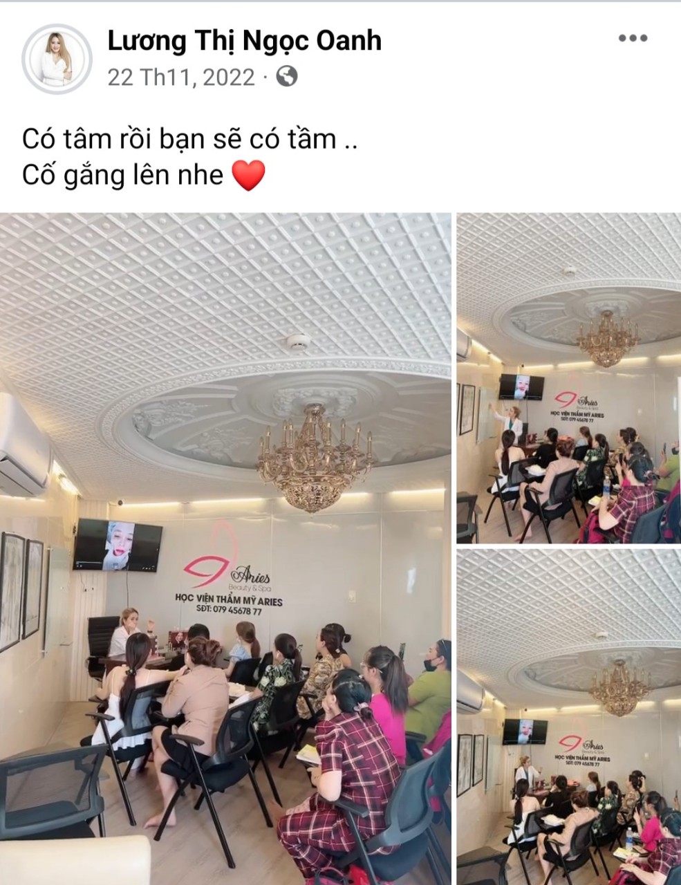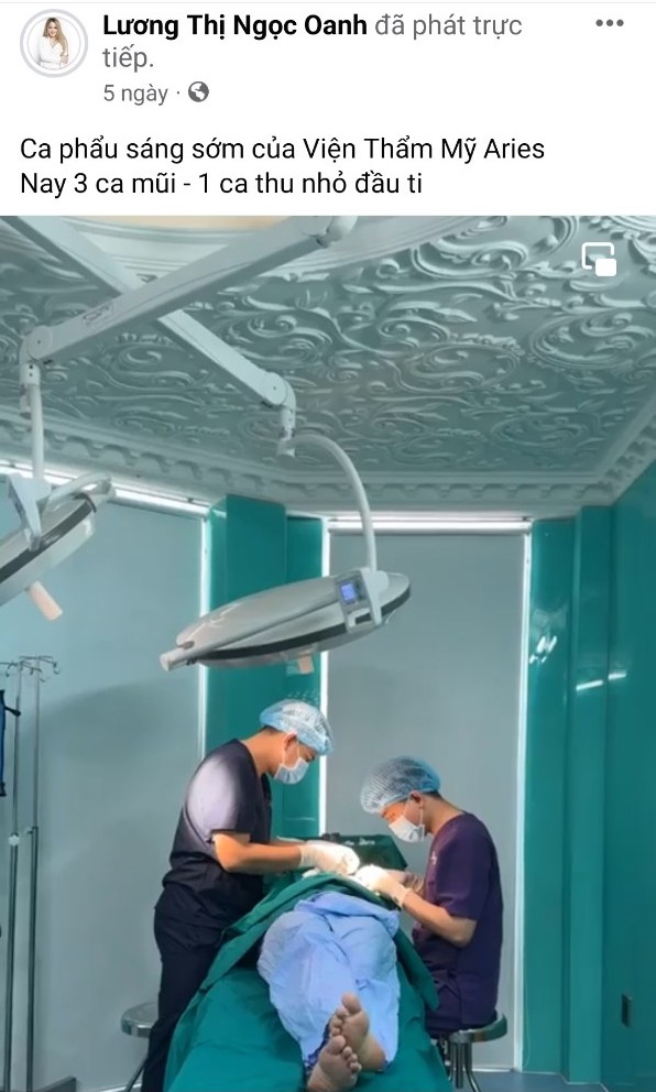 Trong khi đó, trên mạng xã hội facebook vẫn còn một số tài khoản đăng nhiều thông tin hình ảnh quảng cáo về Viện thẩm mỹ Aries. Trong đó có tài khoản mang tên Nguyễn Thị Ngọc Oanh (trùng tên với người đại diện pháp luật của Công ty TNHH Viện thẩm mỹ Aries) đăng nhiều hình ảnh về lễ khai trương Viện thẩm mỹ Aries và các hình ảnh đào tạo học viên. Cùng với đó là các video phát trực tiếp việc thực hiện các dịch vụ thẩm mỹ cho khách như: treo cung mí mắt, nâng mũi, cắt mí ghép mỡ... Bài đăng gần nhất là vào ngày 23/2/2023.