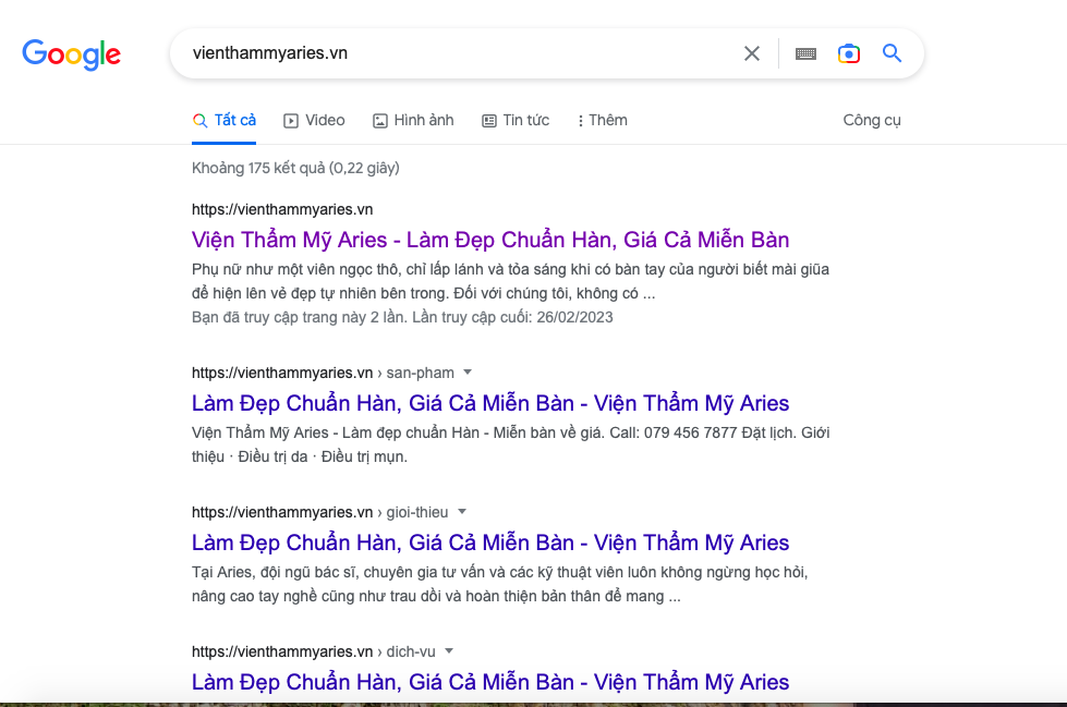 Khi tìm kiếm trên google về website vienthammyaries.vn vẫn cho ra cả trăm kết quả. Thuy nhiện hiện không thể truy cập được vào website này nữa.