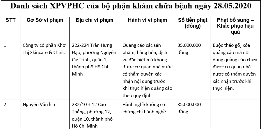 Danh sách XPVPHC của bộ phận khám chữa bệnh ngày 28.05.2020